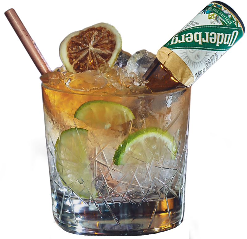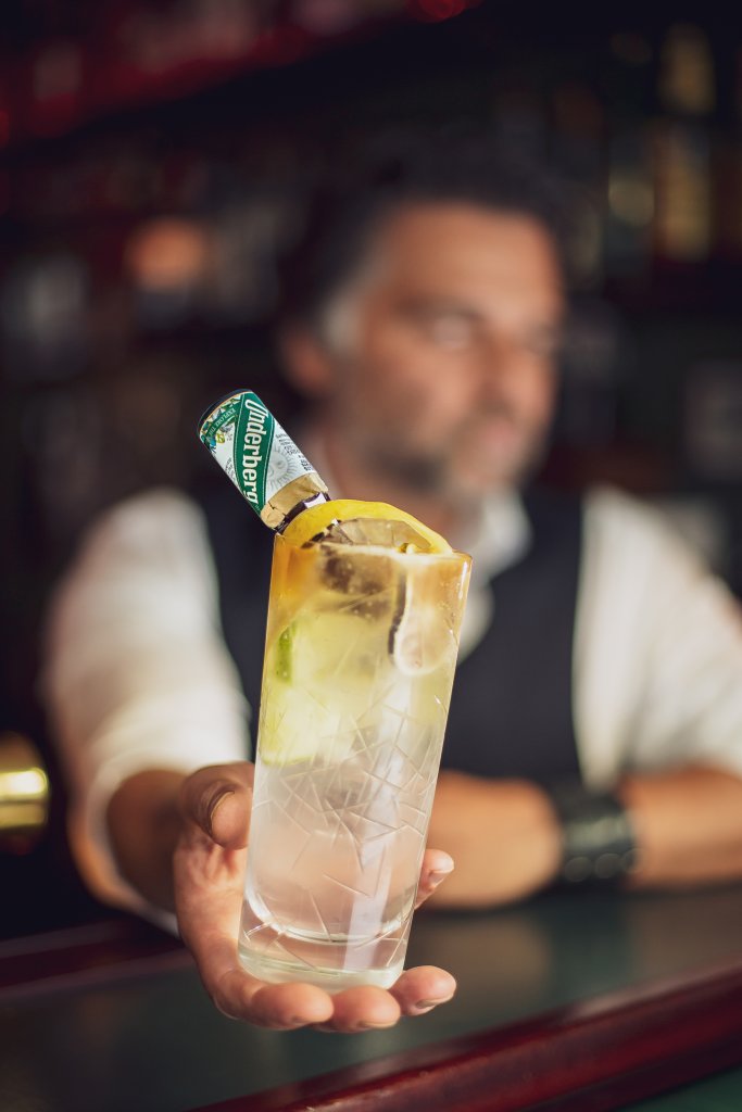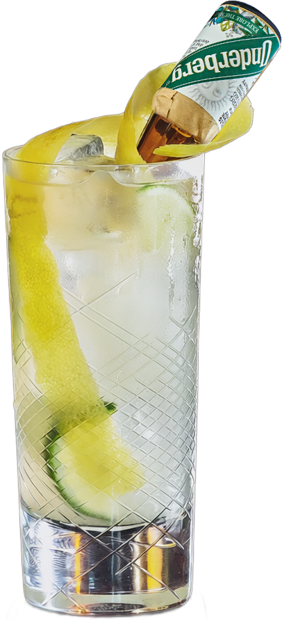Als optisches Highlight wird die leere Underberg Flasche in Szene gesetzt. Das Papier am Hals der Portionsflasche sollte man entfernen, bevor man sie in das Glas gibt. Als ideale Halterung – wenn man die Flasche nicht ins Eis stecken möchte – eignet sich übrigens ein Cocktailspieß oder ein auf Glaslänge geschnittener Strohhalm, über den die Underberg Flasche kopfüber gestülpt werden kann.
