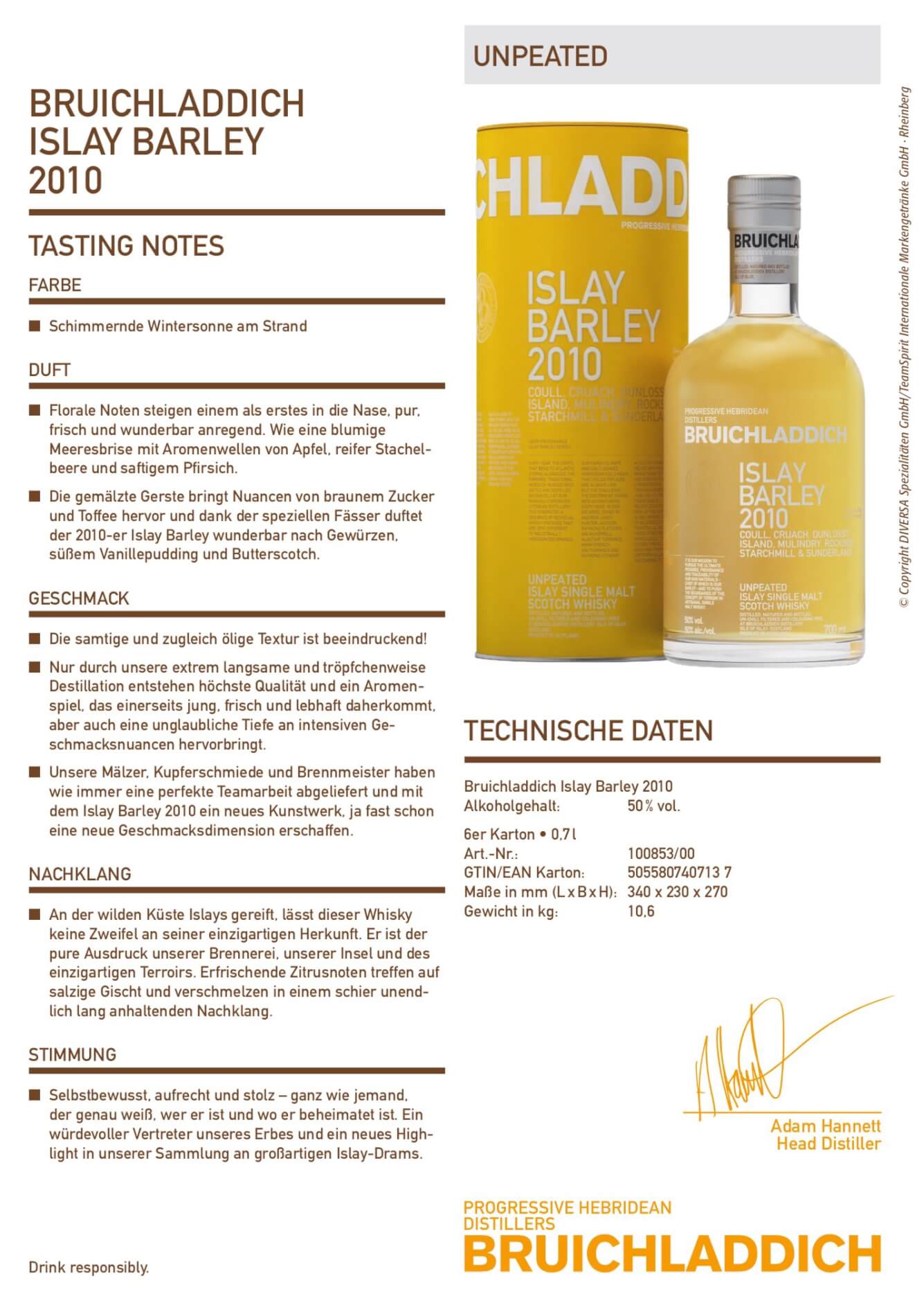 Der neue Release von Bruichladdich ist ein zu 100% authentisches Produkt der wilden Hebriden – geprägt von Herkunft und Terroir. Fans und Fachleute wissen längst; die Bruichladdich- Islay Serie verkörpert den Einfluss von Erde, Wind und Wetter wie auch Leidenschaft für wilde Natur. Bruichladdich Islay Barley 2010 ist das stolze Ergebnis nur eines einzigen Erntejahres.