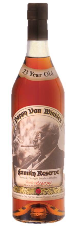 Pappy van Winkle Family Reserve 23 Jahre, Kentucky Straight Bourbon – Dieser sehr seltene Bourbon wurde mit dem Destillations-Wissen von Generationen hergestellt. Nur die vorsichtigsten und teuersten Destillier-Methoden können für einen solch speziellen Whiskey verwendet werden. Es wurde das gleiche Verfahren wie bei dem berühmten 20 jährigen Pappy van Winkle´s Family Reserve angewandt. Dieser Whiskey sollte pur getrunken werden. Jeder Tropfen Wasser oder Eis würde die Einzigartigkeit verwässern.